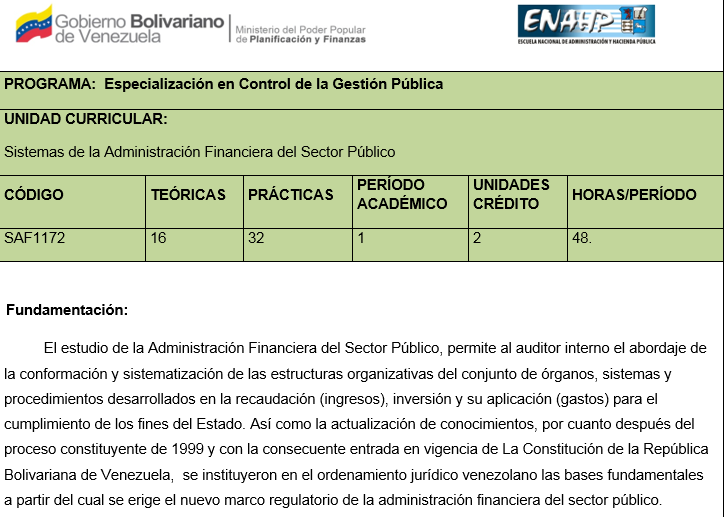En síntesis, esta unidad curricular persigue que el participante se relacione con la organización del Sector Público en cada una de sus formas político-territoriales y en sus manifestaciones de descentralización y desconcentración administrativa, para poder establecer los regímenes presupuestarios aplicables a luz del ordenamiento jurídico que corresponda.
